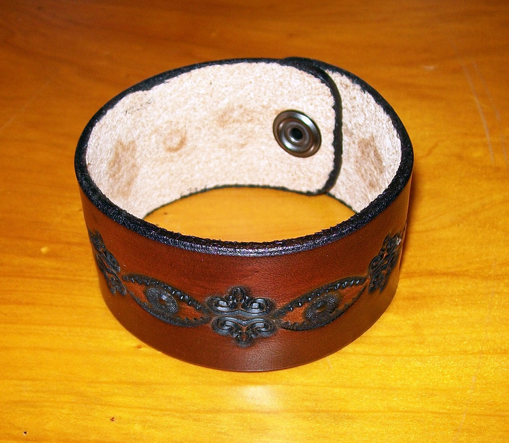 Full grain snap leather wristbands custom made to your wrist size. We have been hand tooling our "dark" design for over 20 years. My parents started tooling this leather design on belts nearly 40 years ago. Today, Jami and I use a deep, rich, oil based dye in Mahogany. The simple geometric tooling is highlighted using black "antique" stain.