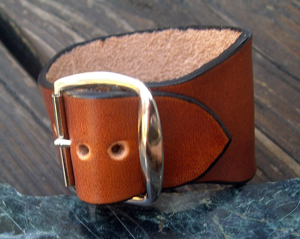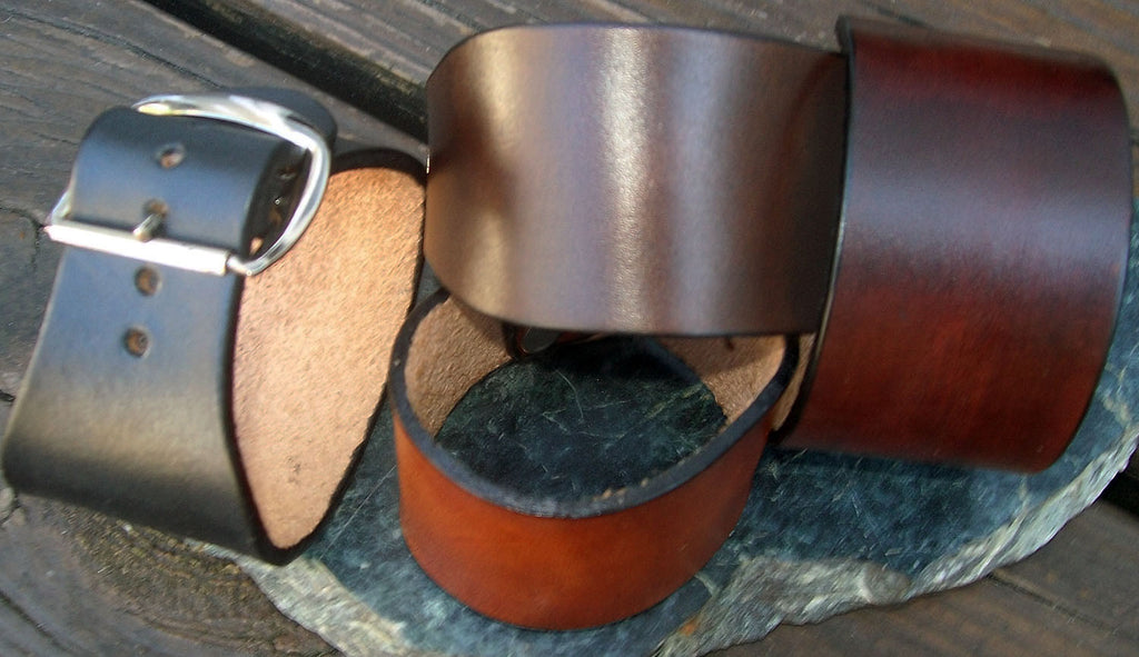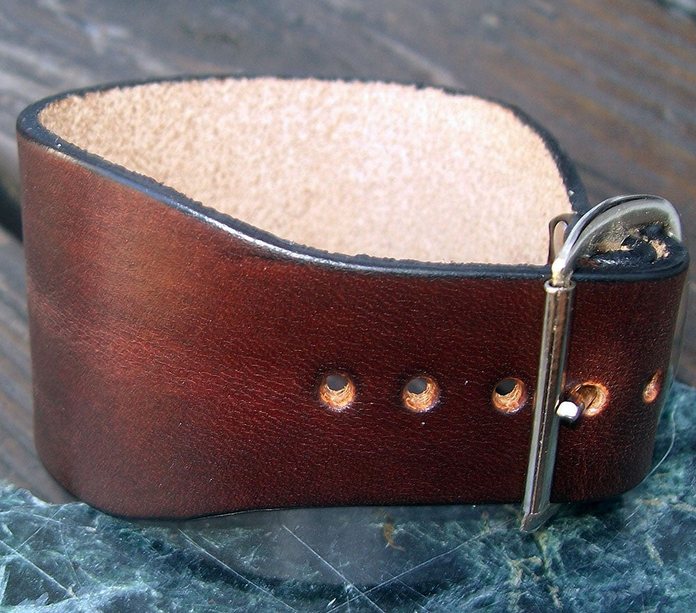 Simple, minimal, style leather wristbands in your choice of hand dye nature tone colors. 1.5" leather bracelets are adjustable with a buckle closure. Hand Dye colors from dark to light are Black, Dark Brown, Mahogany, Saddle Tan. These plain leather wristbands pair perfectly with our minimal leather watch bands. Though these leather wrist bands are adjustable, it is important to check our wristband sizing guide before you order.