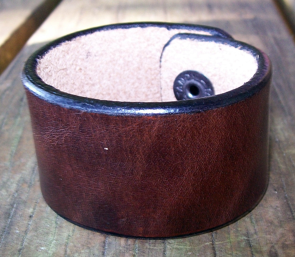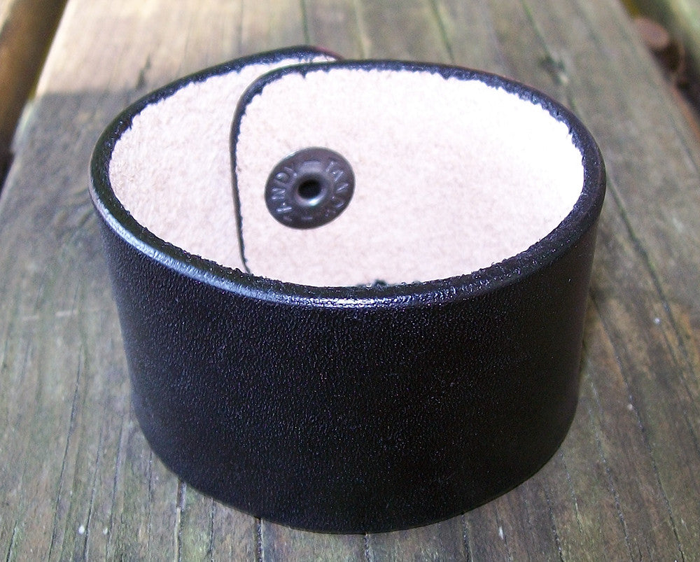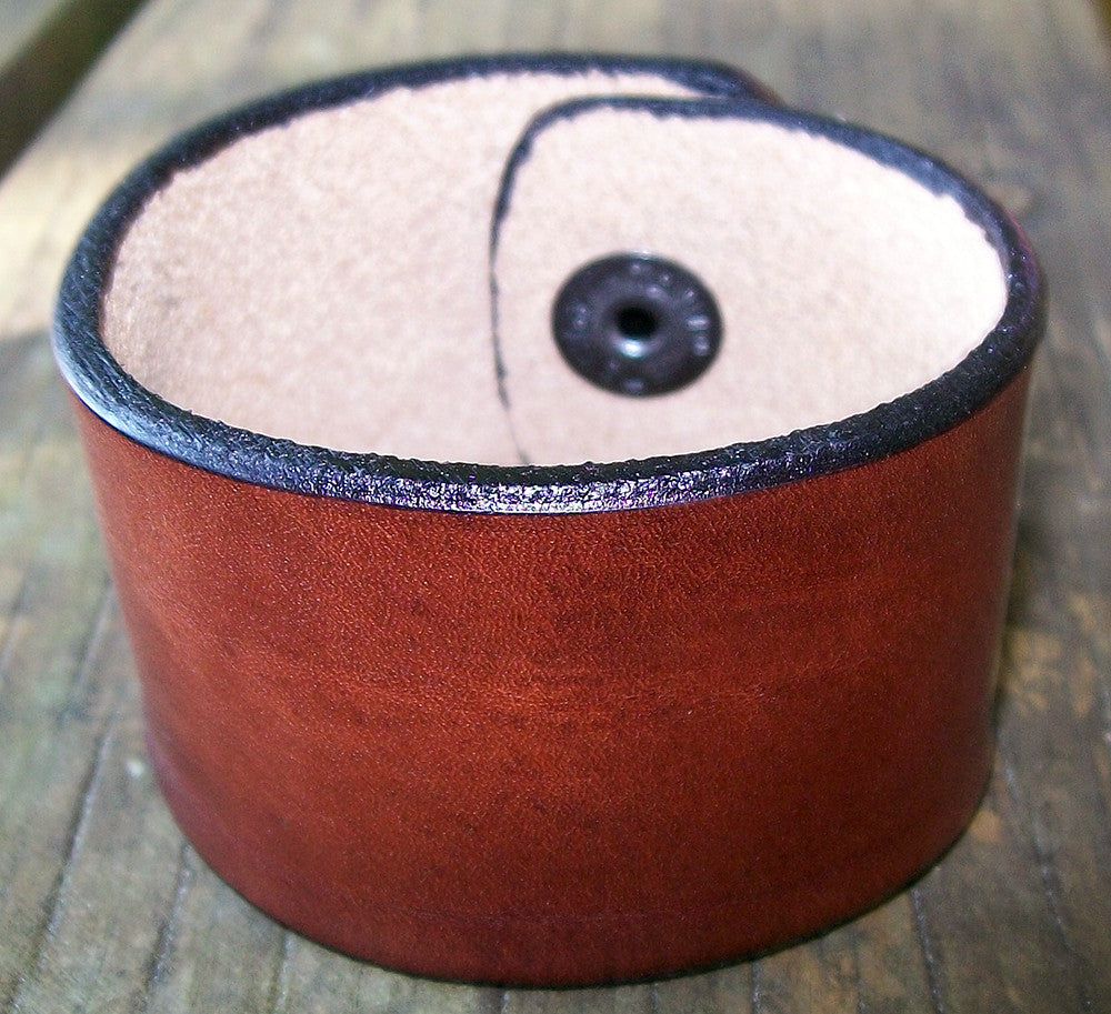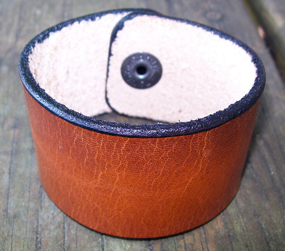 Handmade leather snap wrist cuffs are available in your choice of hand dye colors. We offer optional FREE PERSONALZING on many of our handmade leather goods. These 1.5" wide leather snap bracelets are custom made in your choice of hand dye colors.
