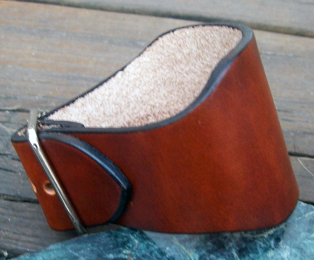Adjustable two inch wide leather wristbands available in your choice of hand dye colors. Whether it is used for fashion or support our handmade leather goods are proudly made in the USA and built to last a lifetime.