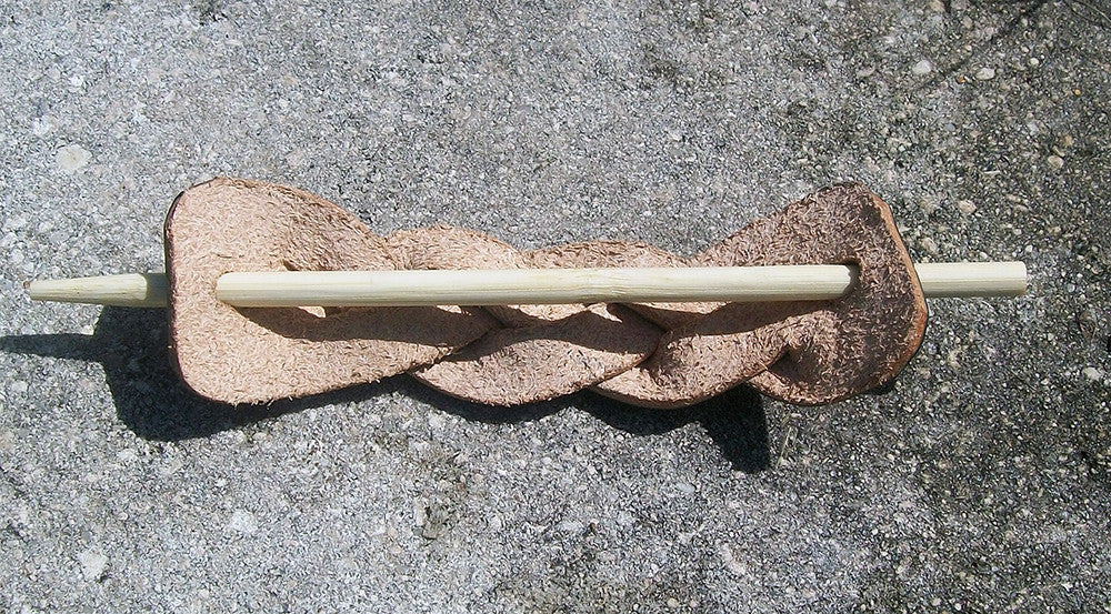These large leather hair wraps measure about 5 1/2 Inches across. The stick is about 6 1/2 Inches long and 1/4" in diameter