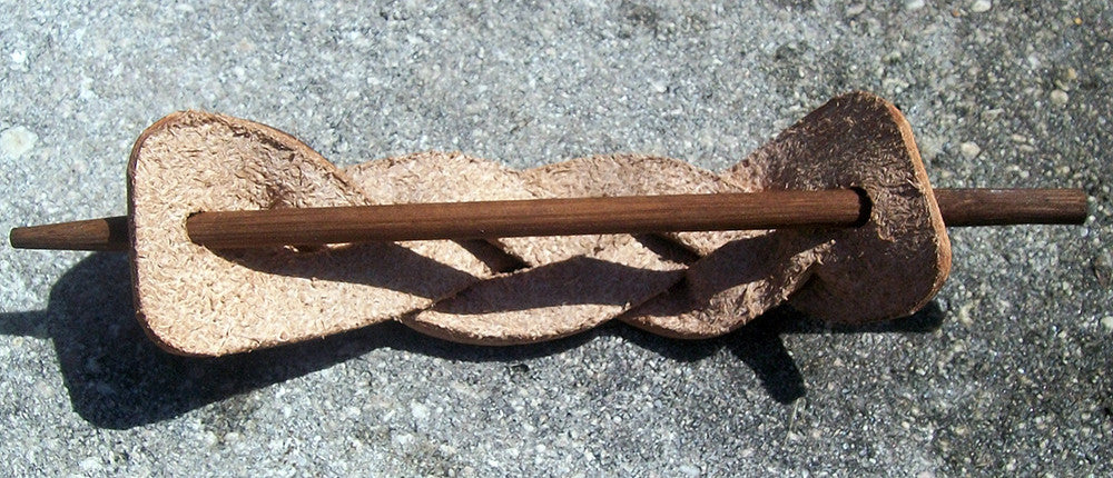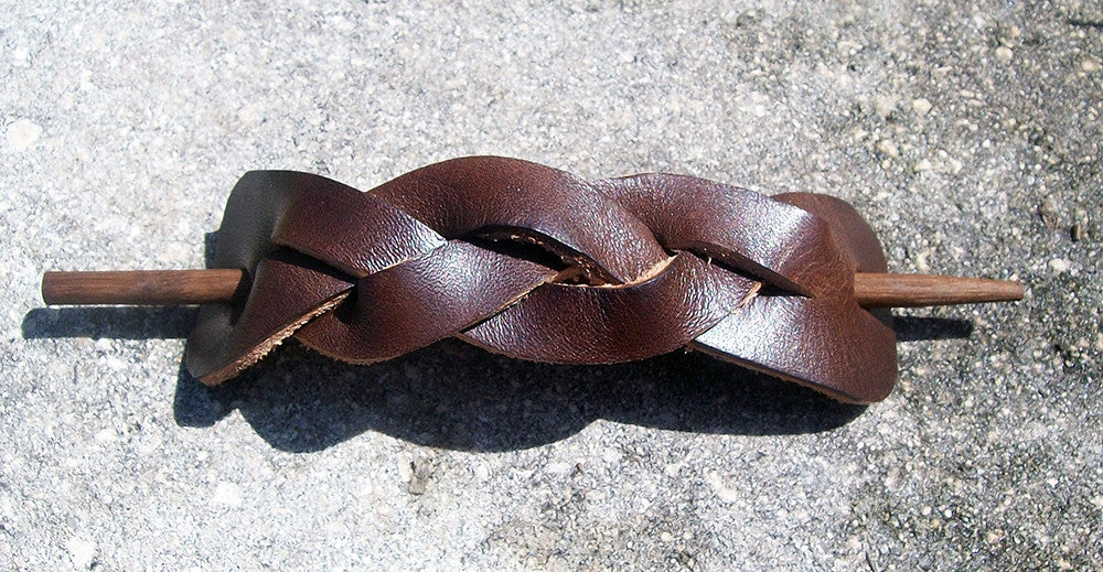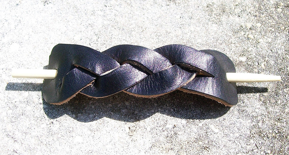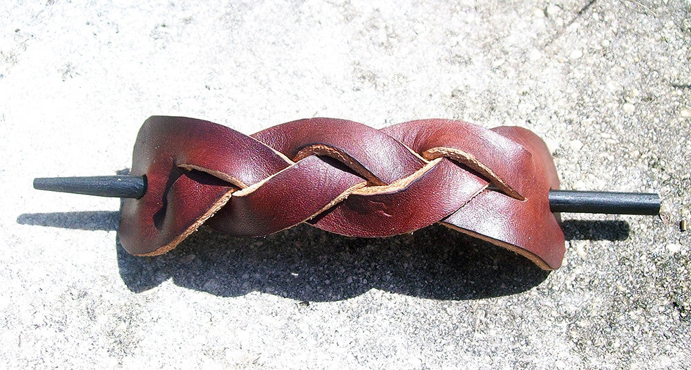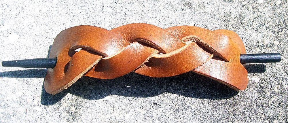 Hard to find, extra large leather barrettes. These barrettes employ a retro style mystery braid. Our hand dye colors from Dark to Light are Black, Dark Brown, Mahogany, and Saddle Tan.