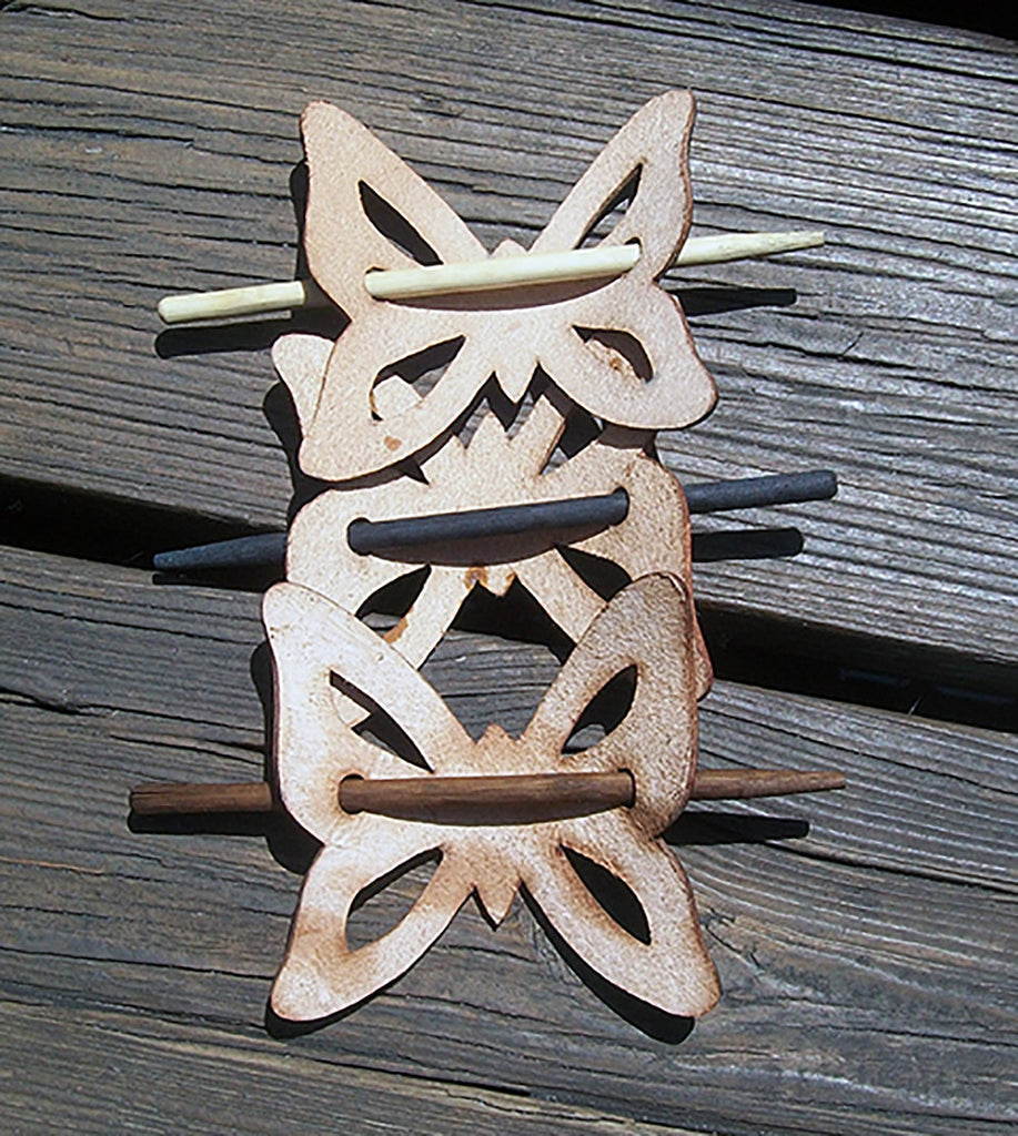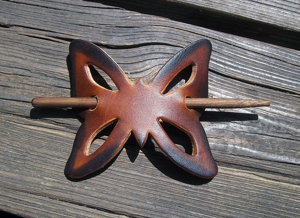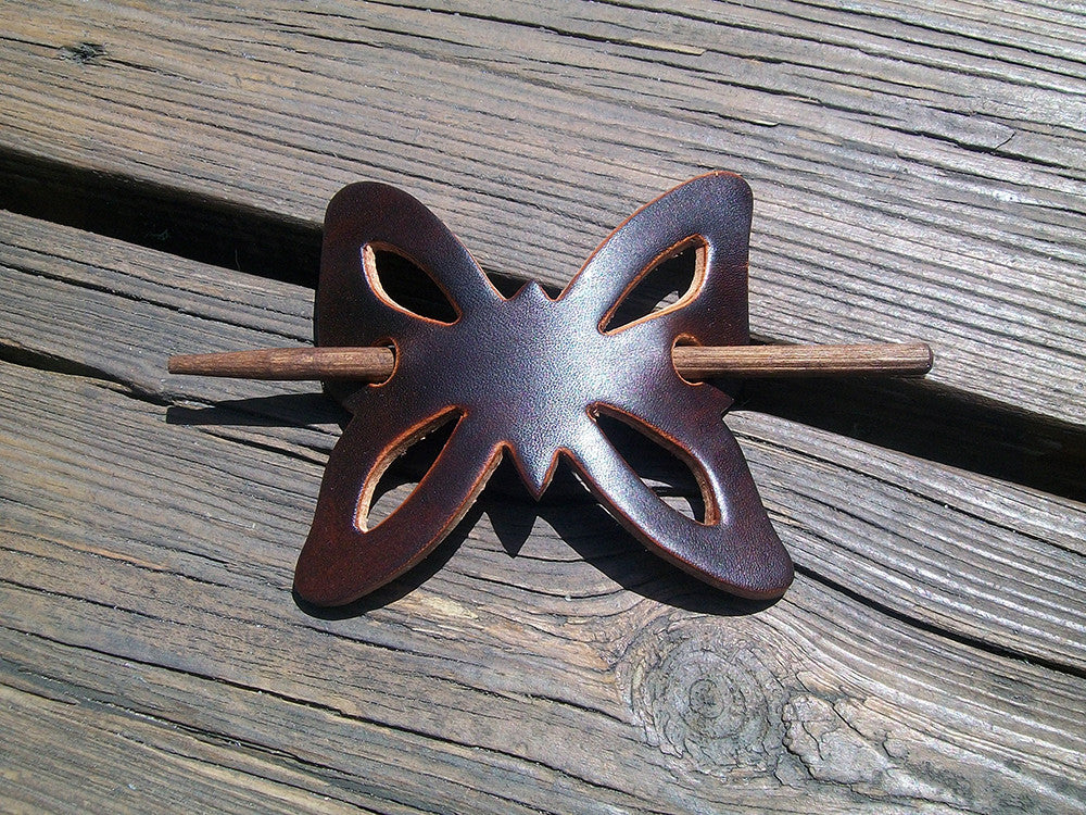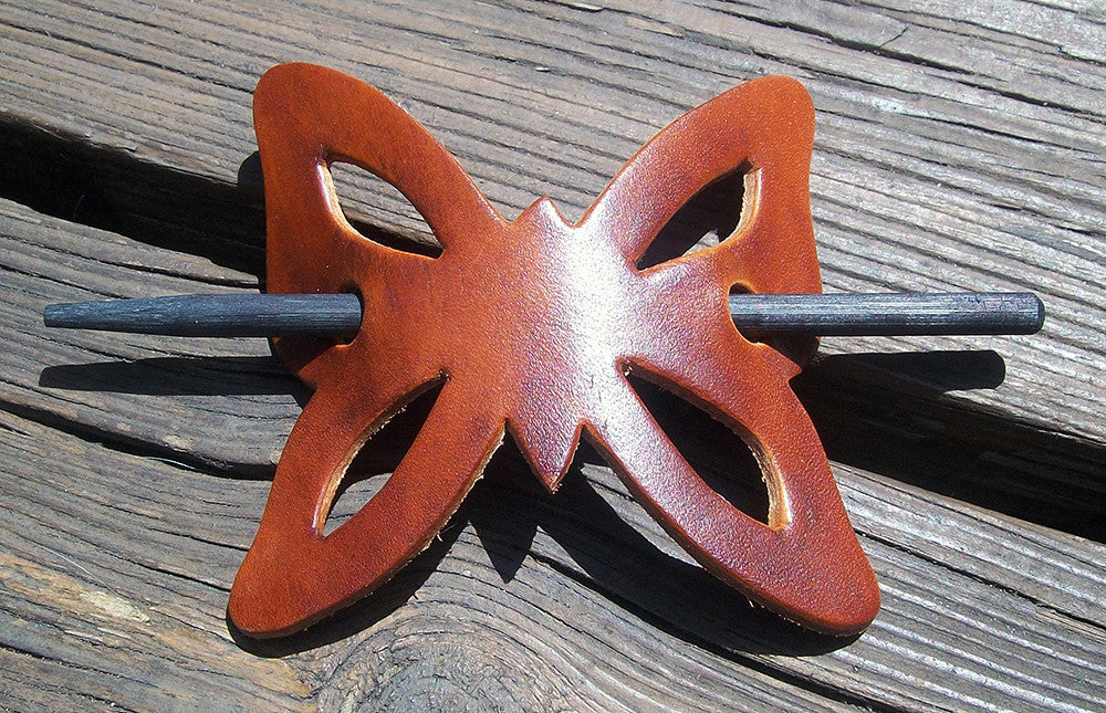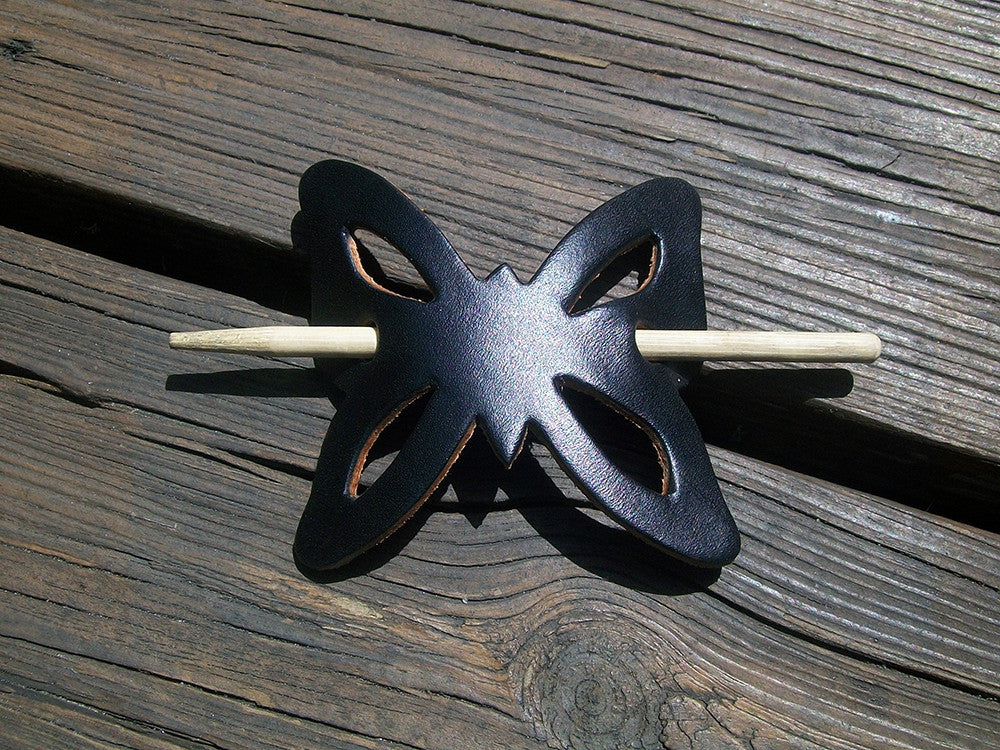 Retro style butterfly shaped handmade leather hair barrettes with wooden pin. This classic leather hair slide style has been around for many decades but never goes out of style. Help us to keep this leather hippy barrette design alive. We handmake all items from full-grain, vegetable tanned cowhide leather. We hand dye the leather grain using oil based dyes.