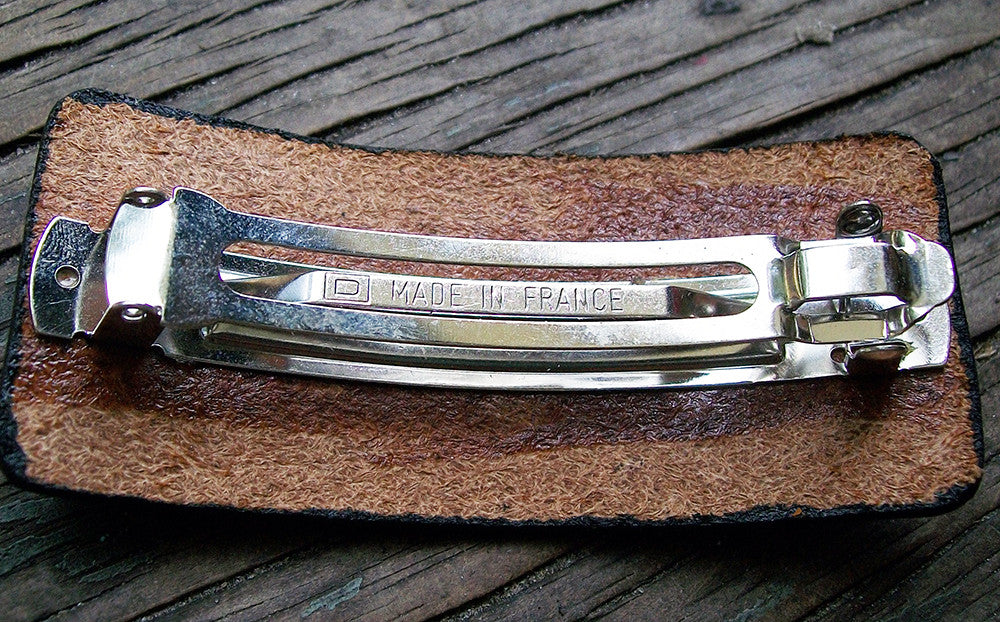 Horse design leather French barrette featuring a simple hand stamped and hand painted horse head and bridle design. The hand dye color is Dark Brown. The leather hair accessory is hand painted using acrylic craft paints The tool used to make this design was discontinued decades ago, but it has remained a popular design in our collection for horse lover girls and women of all ages. These leather French barrettes are handmade in USA! Also, in this case, we are also proud to add that the hardware for these French barrettes is actually Made in France!