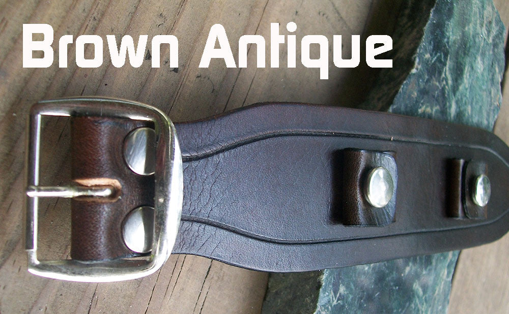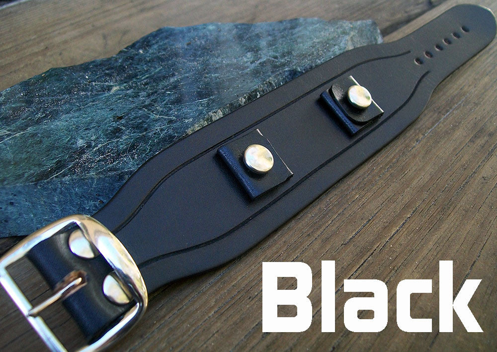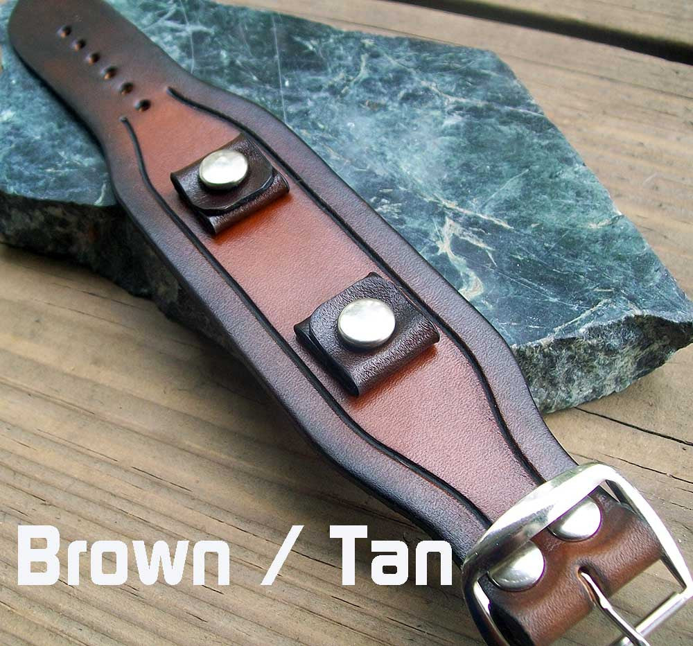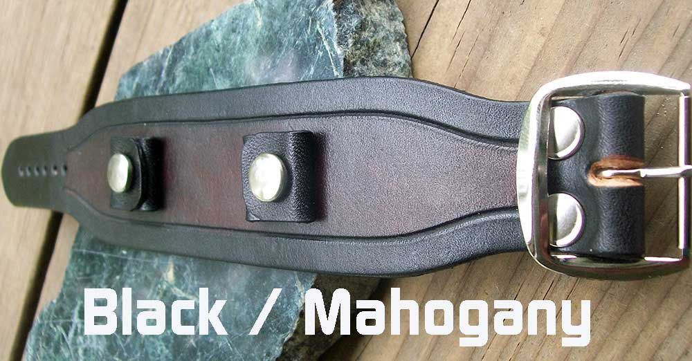 We also offer this leather watch strap style in our signature Two-toned hand dye colors. The two tone colors from light to dark are BROWN/TAN, BLACK/TAN, BLACK/MAHOGANY, and BLACK/BROWN. Find more info on our hand dyed leather colors.
