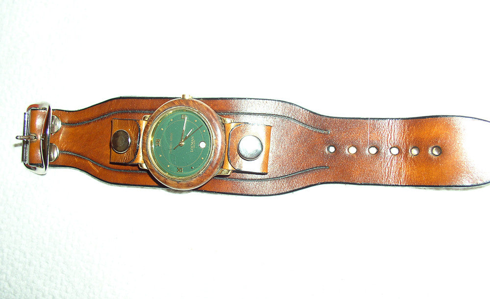 Hand dyed leather watch straps colors are: SADDLE TAN, MAHOGANY, DARK BROWN NATURAL, DARK BROWN ANTIQUE and BLACK.