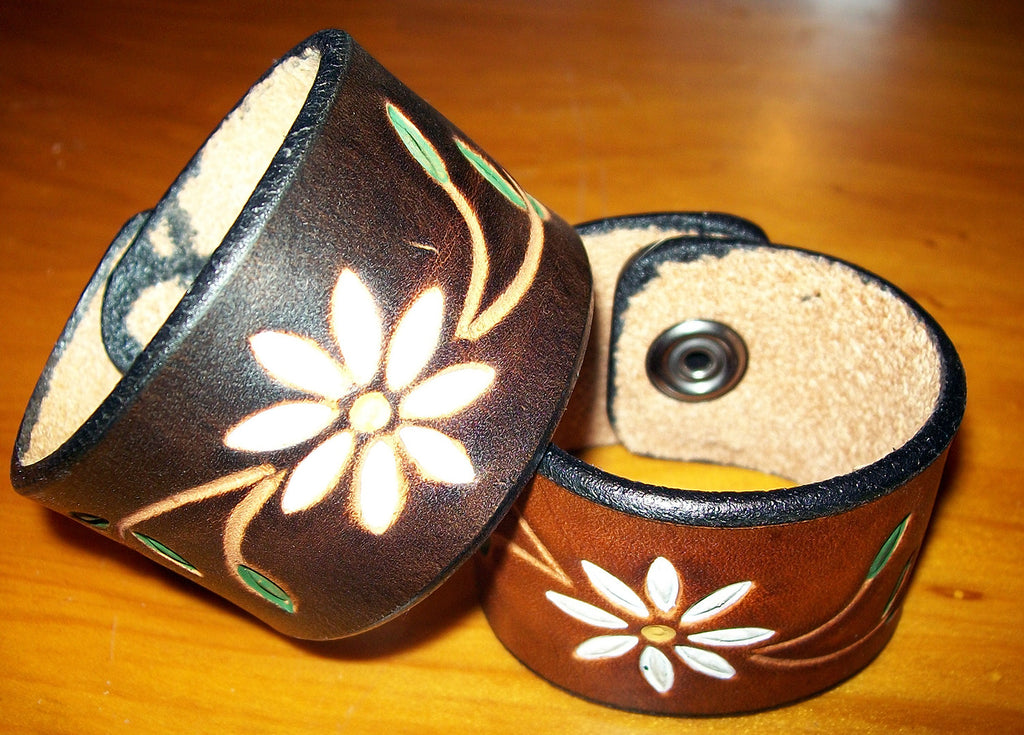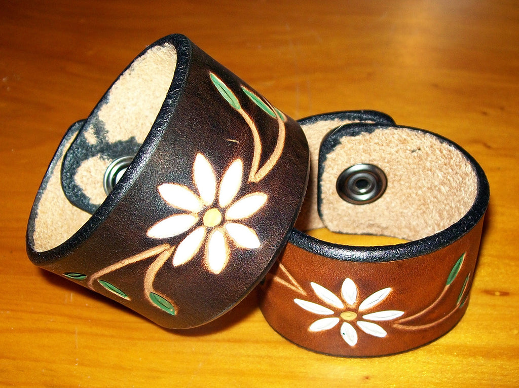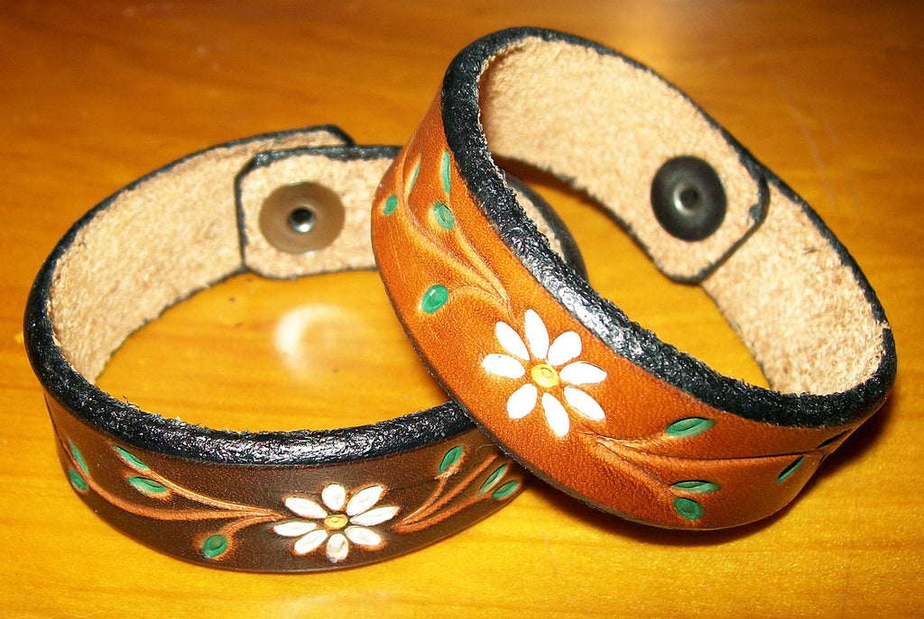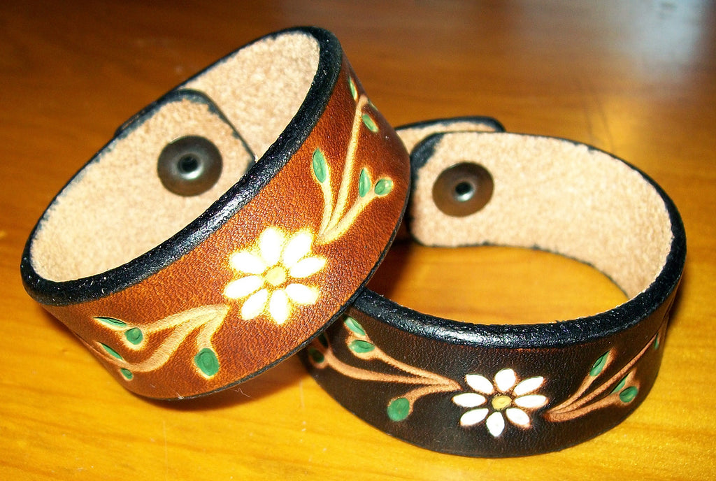 Handmade Leather Bracelets with Tooled and Painted Daisy Flower Design