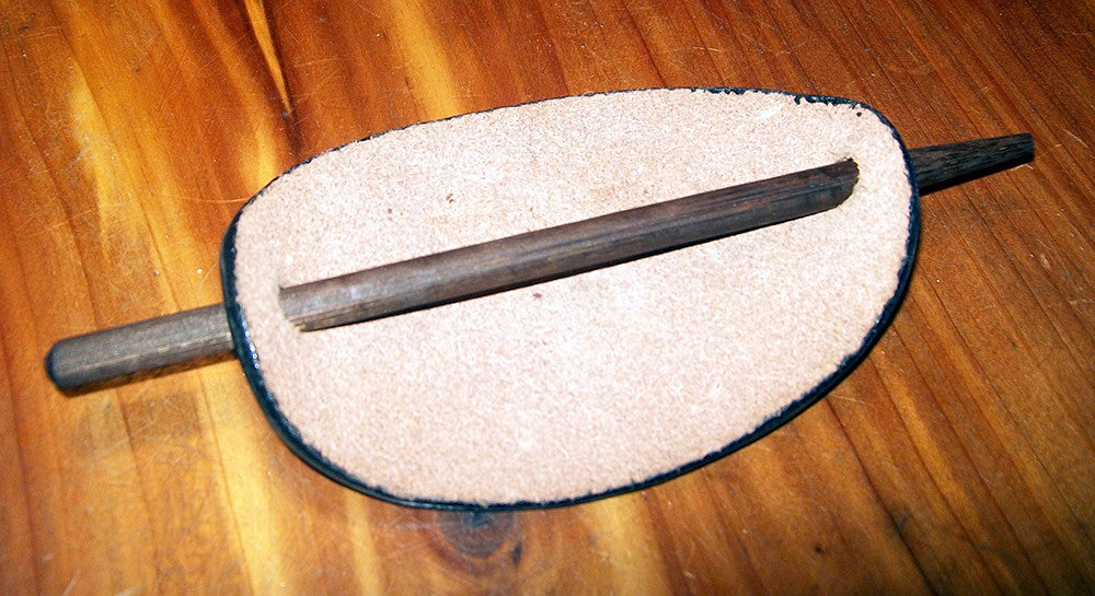 Our medium leather hair barrettes with stick measure approximately 4 Inches across. Distance between the holes is about 3.5 Inches. The wood stick is about 5 1/2 Inches long and 1/4" in diameter. Proudly handmade in the USA! Learn more about us.
